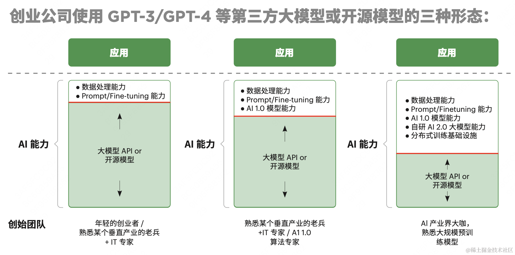 - 调用外部大模型的 API 为主的模式。这类团队本身通常不会有很强的预训练模型开发能力,更多是具备应用层的能力。基于 API 或开源模型去开发应用,至多做一些微调与修改。